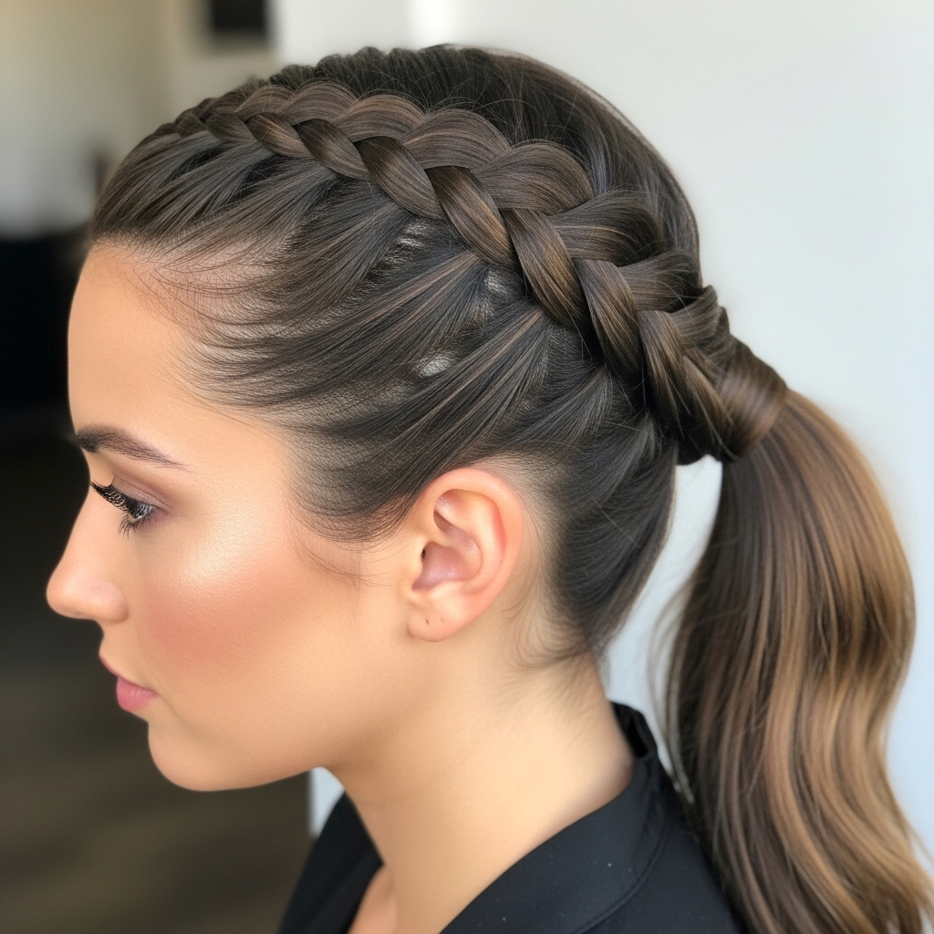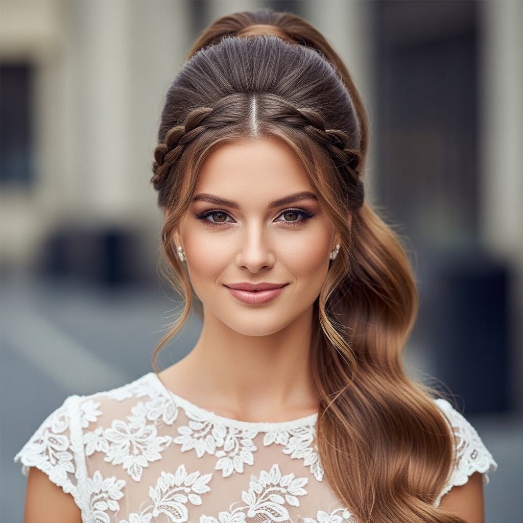 Why choose between a braid and a ponytail when you can have both? This elegant style incorporates a braid into the base of the ponytail. Start by French braiding or Dutch braiding one side of your hair, starting from the temple and working your way back towards the crown. Once you reach the point where you want to place your ponytail, gather all of your hair—including the tail of the braid and the rest of your loose hair—and secure it into a ponytail. This adds a beautiful, intricate detail that makes the style look complex and carefully crafted.