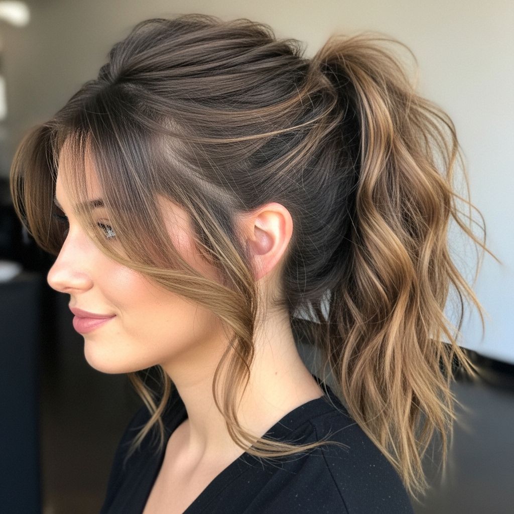 Sleek doesn’t always have to mean perfectly smooth. The messy textured ponytail is all about controlled chaos. Start by adding texture to your hair with a texturizing spray or sea salt spray. Pull your hair back into a ponytail, but keep your hands loose. Gently pull out a few face-framing pieces and some smaller strands around the crown to soften the look. The base should be secure, but the tail itself can be wavy, curly, or piecey. This style is perfect for second-day hair and exudes a cool, “I woke up like this” vibe.