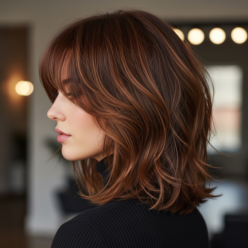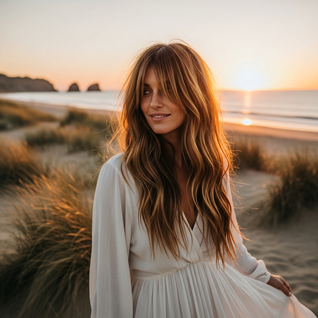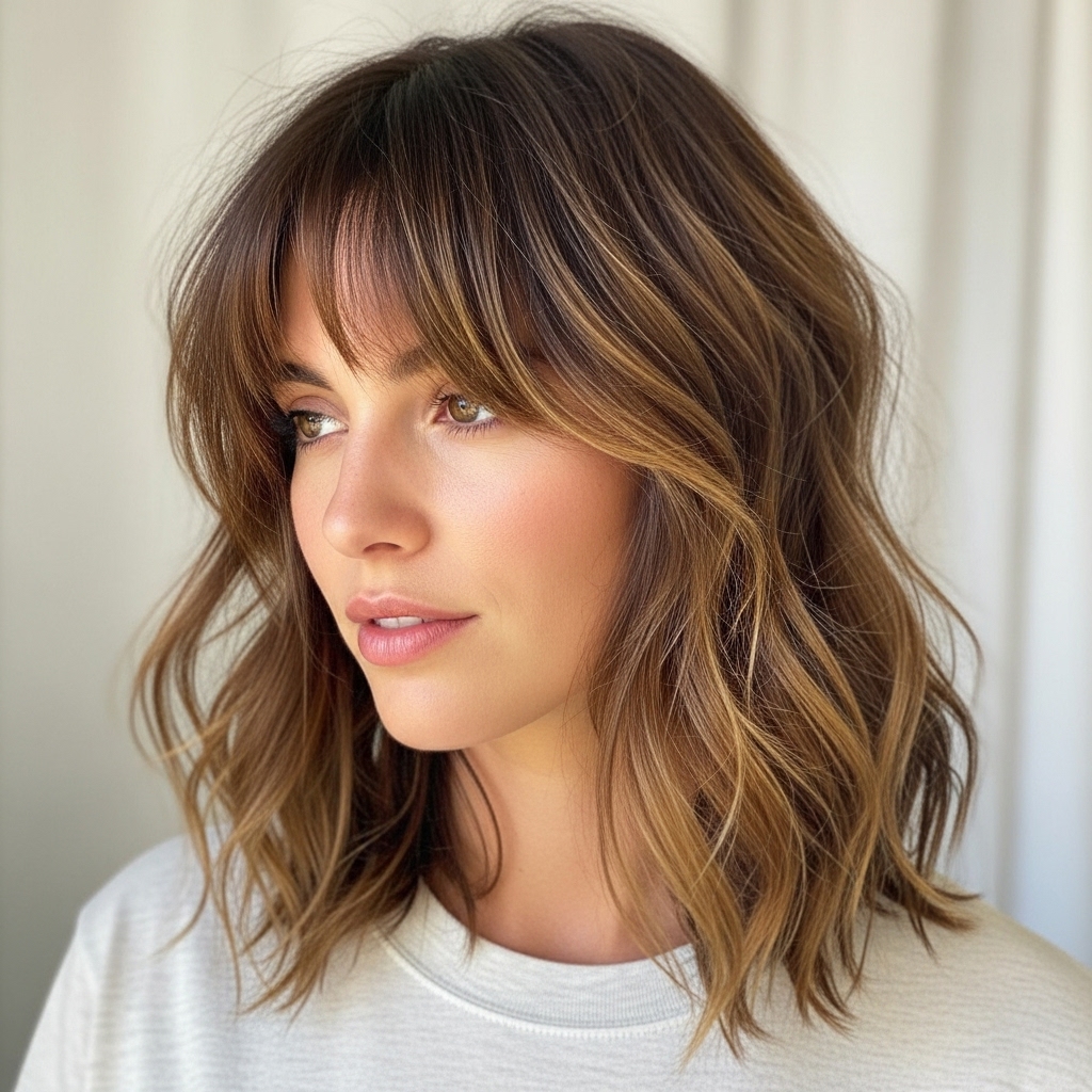 Pair your angled bangs with loose, beachy waves for the ultimate bohemian-inspired hairstyle. The contrast between the structured fringe and the carefree waves creates a balanced and dynamic look. Use a curling wand to create relaxed, undone waves throughout the rest of your hair, ensuring your bangs remain smooth or slightly textured to blend seamlessly.