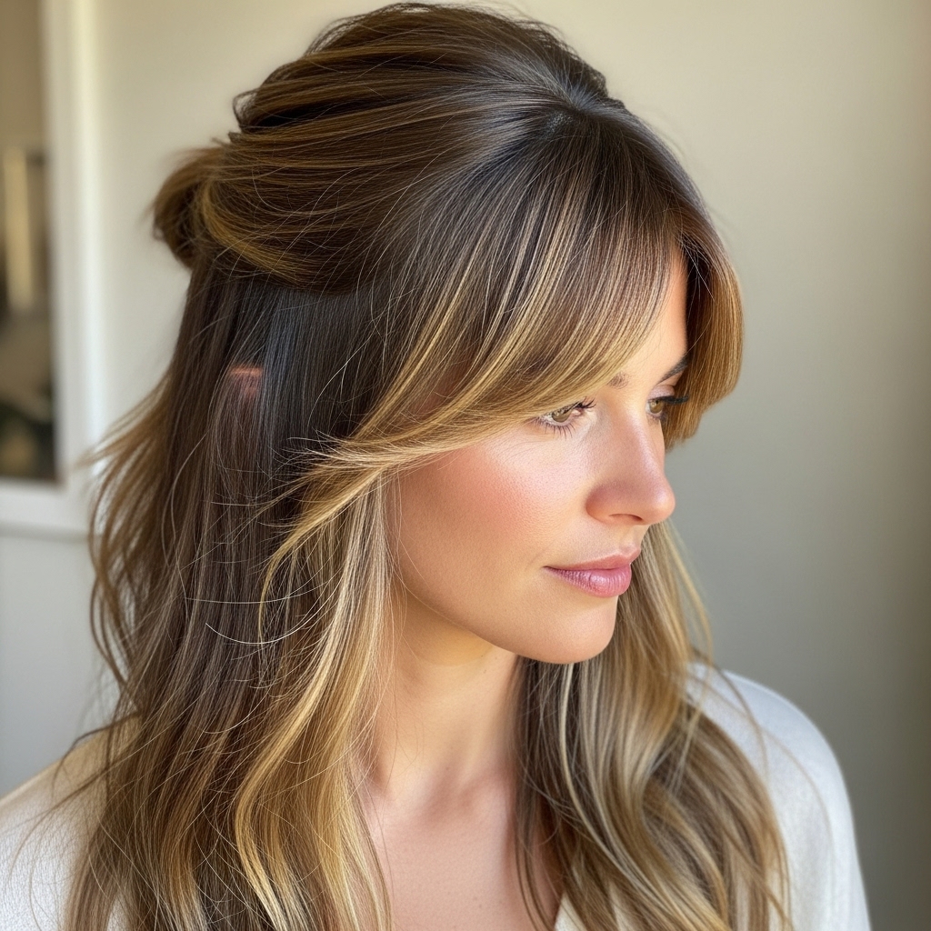 The half-up hairstyle is a true friend to angled bangs. Pull the top section of your hair back, but leave your bangs and some face-framing layers free. This style beautifully highlights the angle of your bangs while keeping hair out of your eyes. You can make it casual with a simple twist or dress it up with a small claw clip or a braided crown.