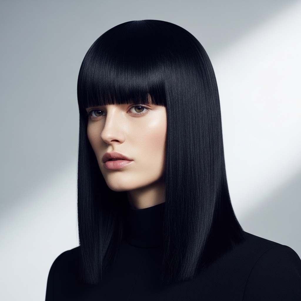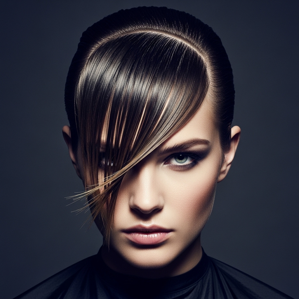 There’s something undeniably chic about pin-straight hair. Use a flat iron to create a sharp, geometric line with your angled bangs. The clean, severe lines of this style are incredibly modern and powerful, making a strong style statement that works in any professional or urban setting.