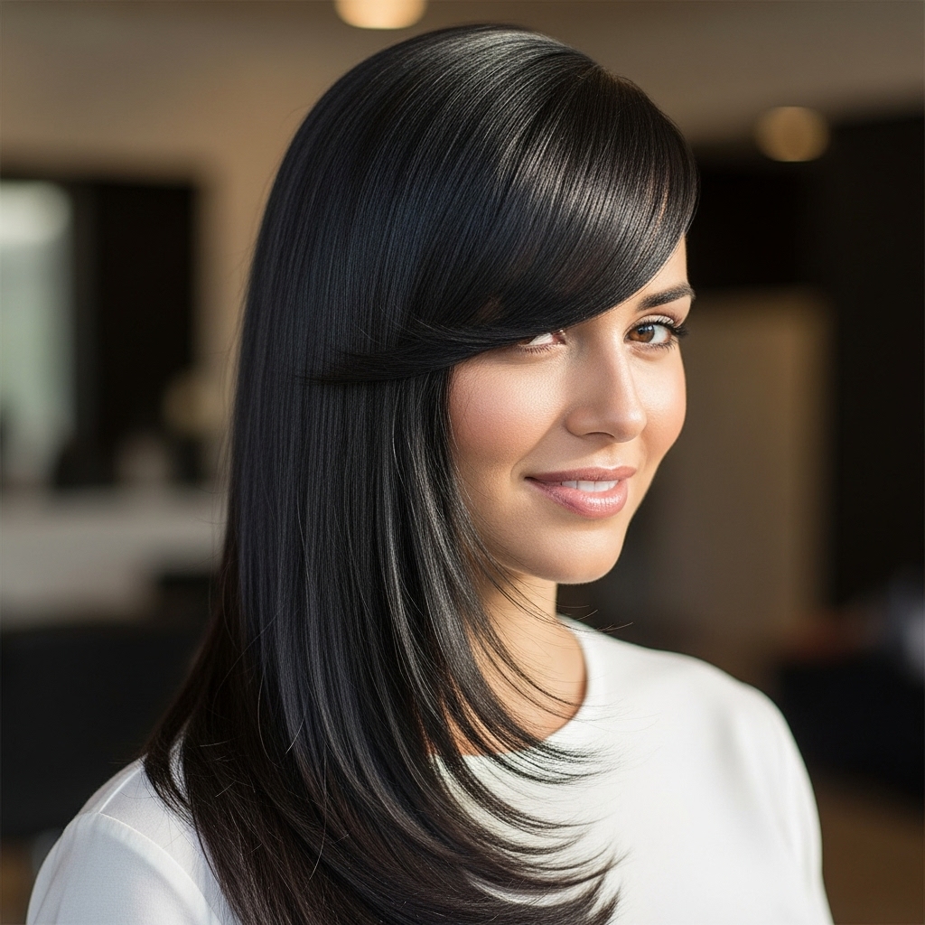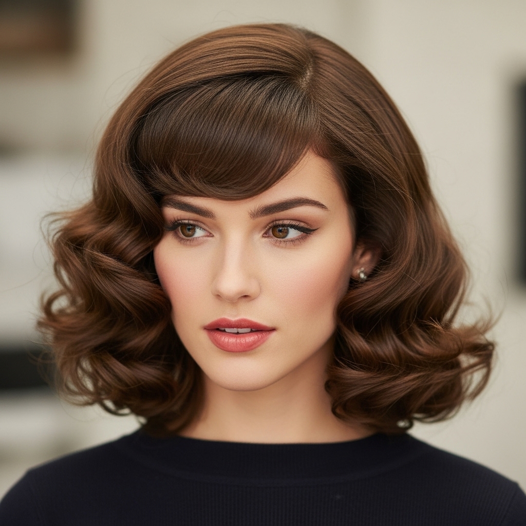 Embrace the natural direction of your bangs with a dramatic side-swept swoop. This style is incredibly elegant and works wonderfully for formal events. Using a large-barrel curling iron, create a soft, sweeping curve that carries the bangs across your forehead. Pin them loosely behind your ear on the opposite side for a romantic, red-carpet-ready look.