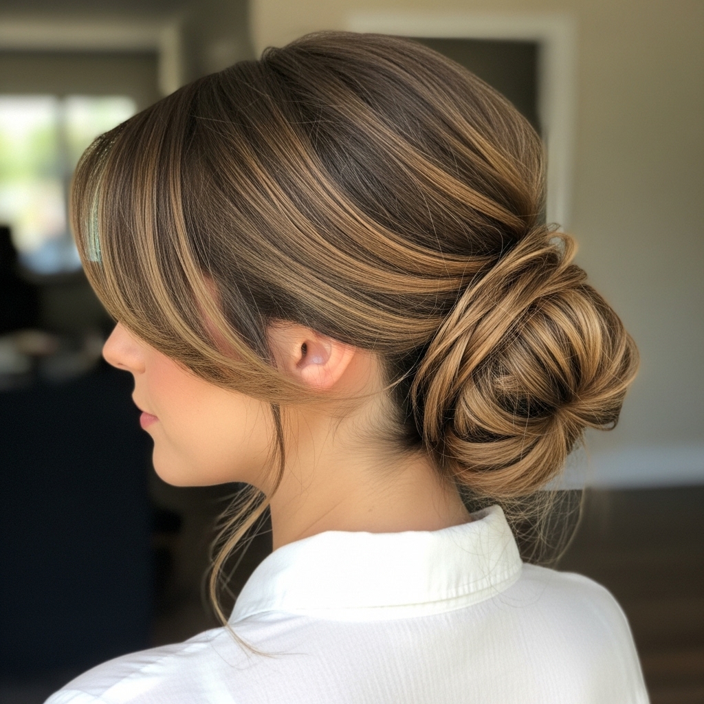 Don’t think your bangs exclude you from elegant updos. A low chignon or a twisted updo becomes even more interesting with angled bangs. Style your updo as usual, but let your bangs be the beautiful frame for your face. This combination is perfect for formal occasions, as it looks intentional, sophisticated, and beautifully completes your look.
