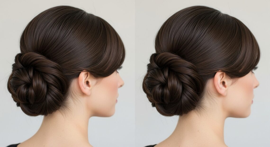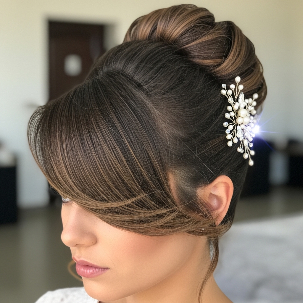 Pro Tip: Use bobby pins that match your hair color to discreetly secure any shorter pieces of your bangs that might not want to cooperate with the updo’s flow.