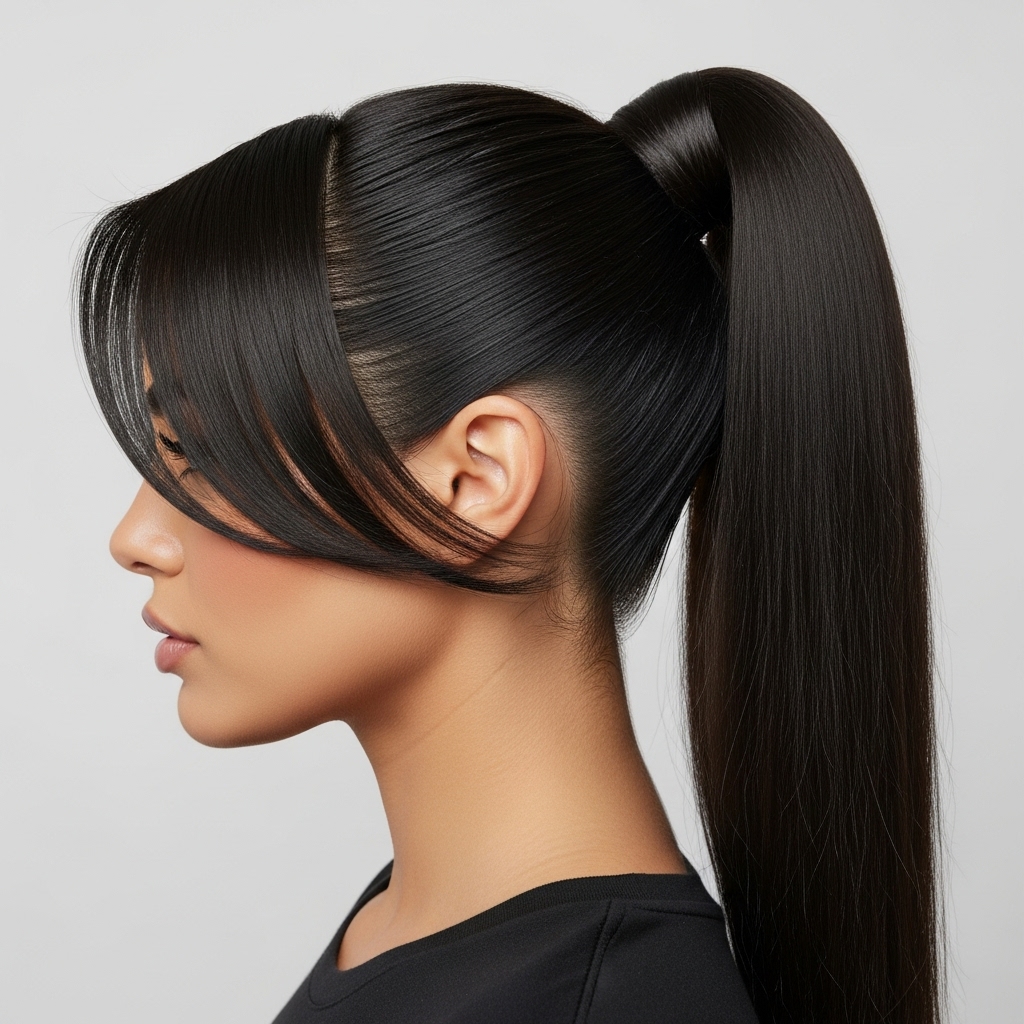 Elevate a simple high ponytail by incorporating your angled bangs. Pull your hair back into a tight, high ponytail, but leave your bangs free. Style them to fall gracefully along the side of your face. This creates a powerful, high-fashion silhouette that is both sporty and sophisticated, perfect for a day when you need your hair out of your face but still want to look put-together.