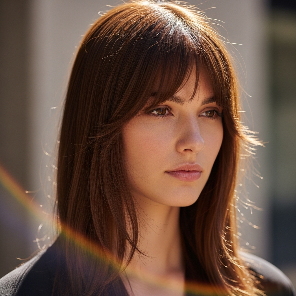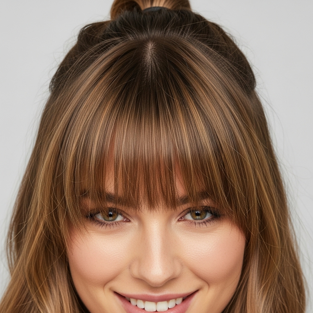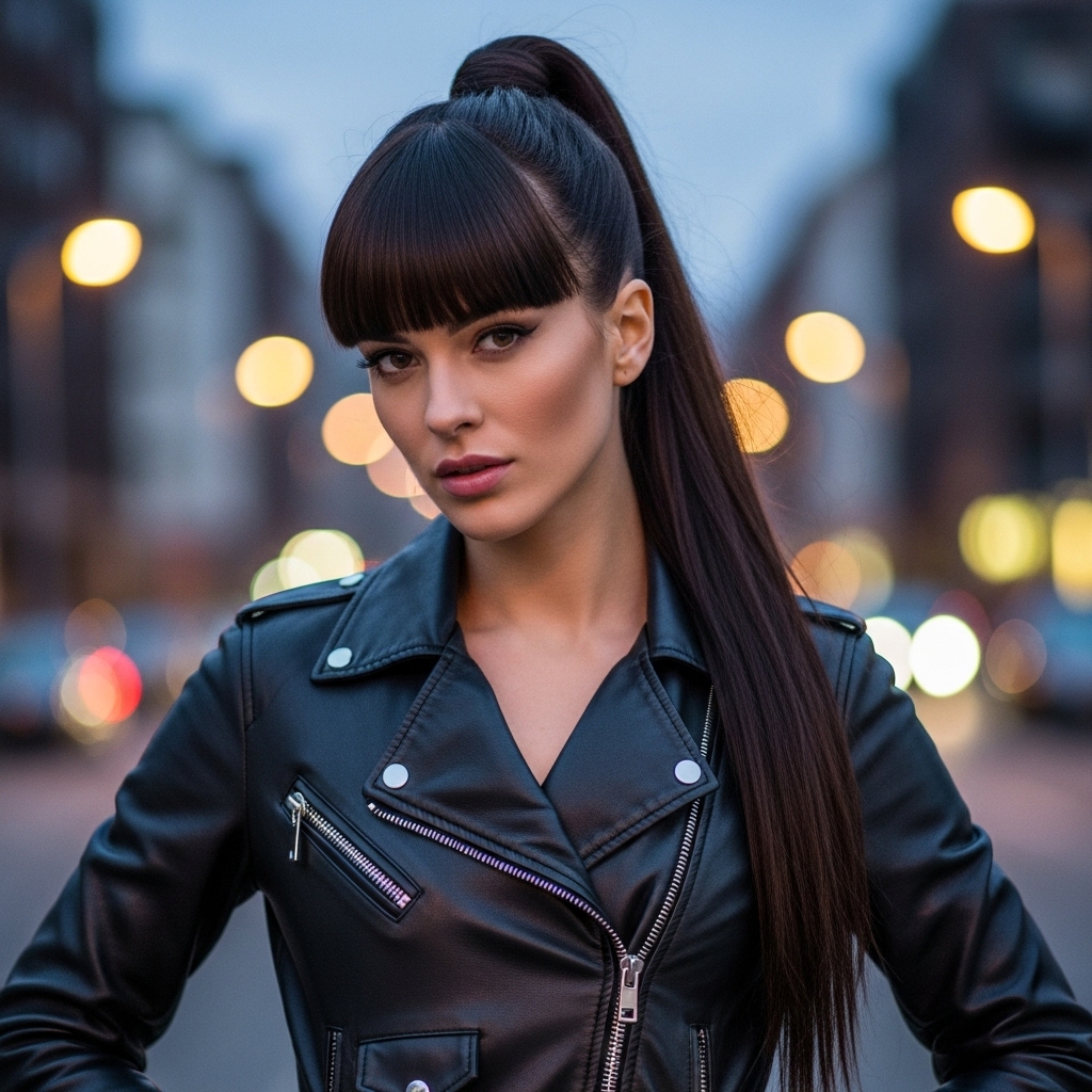 A ponytail is a classic, but adding straight bangs transforms it from basic to incredibly chic. Whether it’s a high, slicked-back pony or a low, relaxed one, your bangs become the focal point. Style your bangs as desired—sleek, piece-y, or side-swept—and then gather the rest of your hair. The contrast between the structured ponytail and the softness of the fringe in front is a winning combination that works for the gym, the office, or a dinner date.