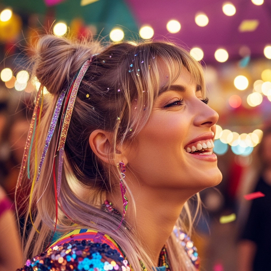 Double the fun! Part your hair down the middle and create two high ponytails on either side of your head. Twist each ponytail into a bun and secure it. The shorter layers around your face and at the nape of your neck will naturally escape, creating a playful, festival-ready look that’s far from childish. It’s a great way to manage a layered cut on a windy day.
