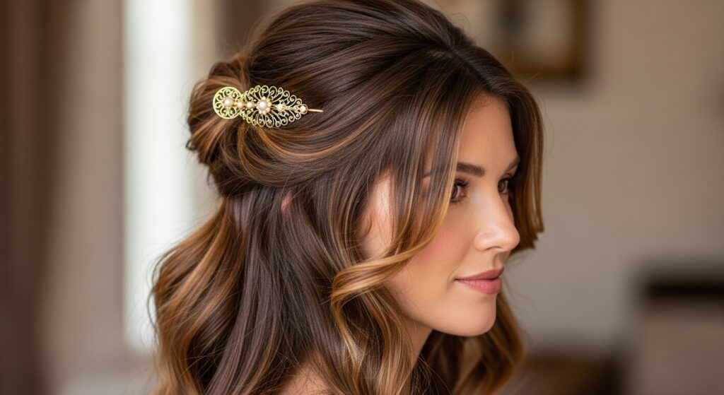 This timeless style gets a modern update when done with wavy hair. Take the top section of your hair, but instead of pulling it straight back, tease the crown slightly for volume before securing it. You can use a small clip, a chic barrette, or even a simple tie. Let the rest of your waves flow freely down your back. This look beautifully showcases your cut while keeping hair out of your face, making it perfect for both work and weekend brunches.