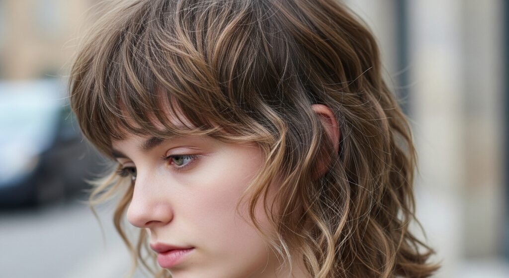 The modern mullet or wolf cut, characterized by short layers in the front and longer layers in the back, is a dream for wavy hair. Style it by diffusing with a mousse to create volume and separation. The natural texture of your waves will bring this edgy cut to life, creating a dynamic, eye-catching shape that’s full of personality.