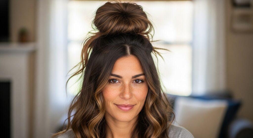 Second-day wavy hair often has amazing texture but can be flat at the roots. The pineapple puff is the perfect solution. Gather your hair into a very high, loose ponytail on top of your head—the “pineapple.” Gently pull the ponytail holder down slightly to create a small, casual puff of hair at your crown. This preserves your waves and gives you a cute, playful style that’s perfect for running errands or a casual day out.