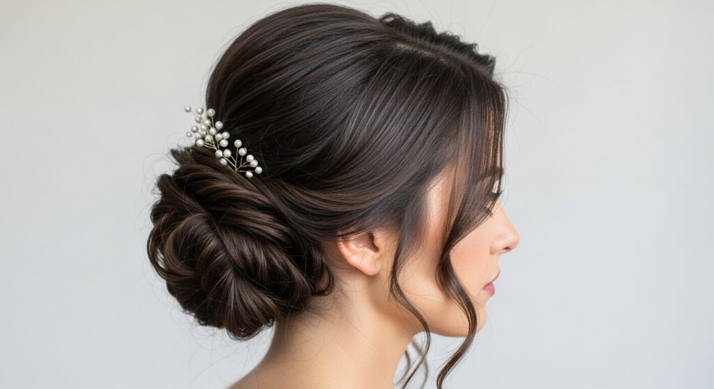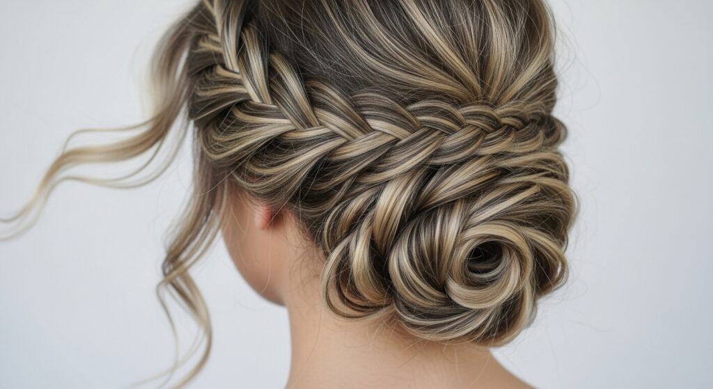 Asymmetry is incredibly alluring, and the side-swept wavy updo masters this. Gather all your hair to one side, as if you’re making a low side ponytail. Instead of securing it with a band, twist or braid it loosely and then coil it into a bun, securing it just behind your ear. Pull out waves around your face and at the nape of your neck on the opposite side to create a soft, romantic, and deeply flattering silhouette.