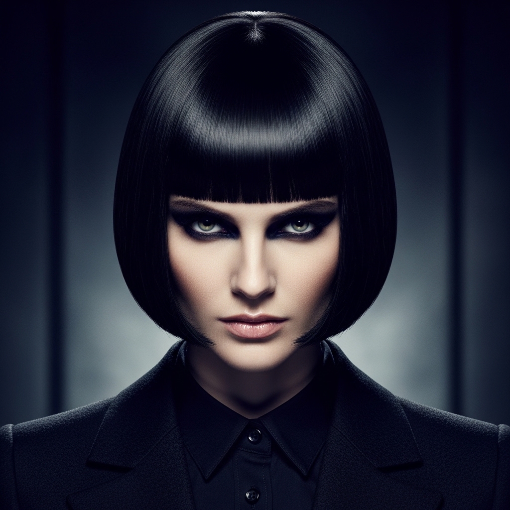 Precision is key. The bangs must be perfectly straight. Use a flat iron on both the bangs and the ends of the bob to achieve that sharp, crisp line. A shine spray adds to the dramatic, otherworldly effect.