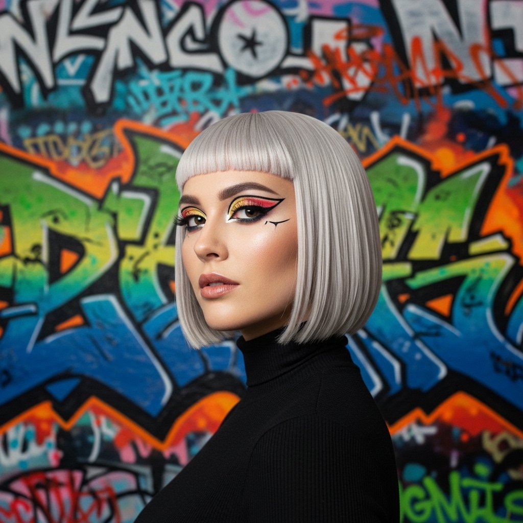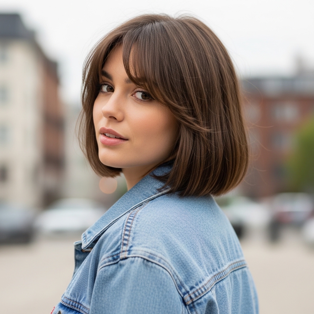 Keep the bangs wispy and textured, not blunt or heavy. Style the bob with volume at the roots. This look is all about balance—the softness of the wispy bangs against the strong shape of the bob.