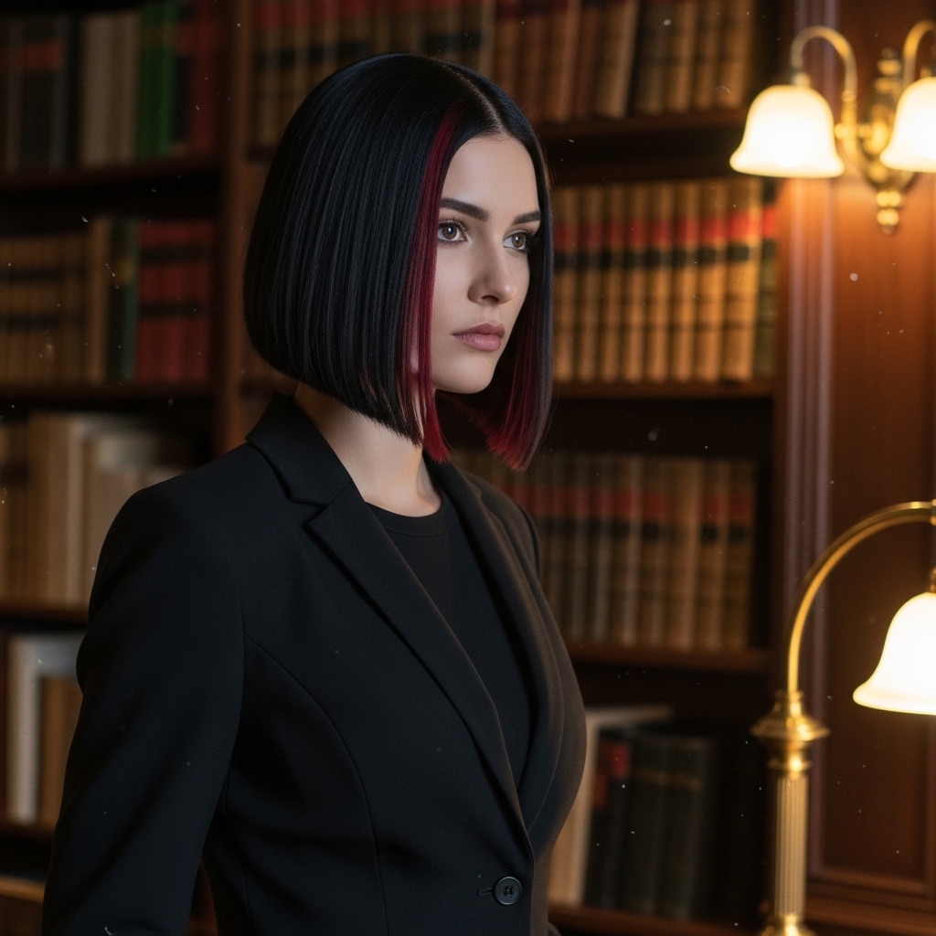 This is the ultimate vampire haircut for 2026. It’s sleek, precise, and feels incredibly expensive. The cut itself is a classic, but that single, bold red streak transforms it into something from a modern gothic novel.