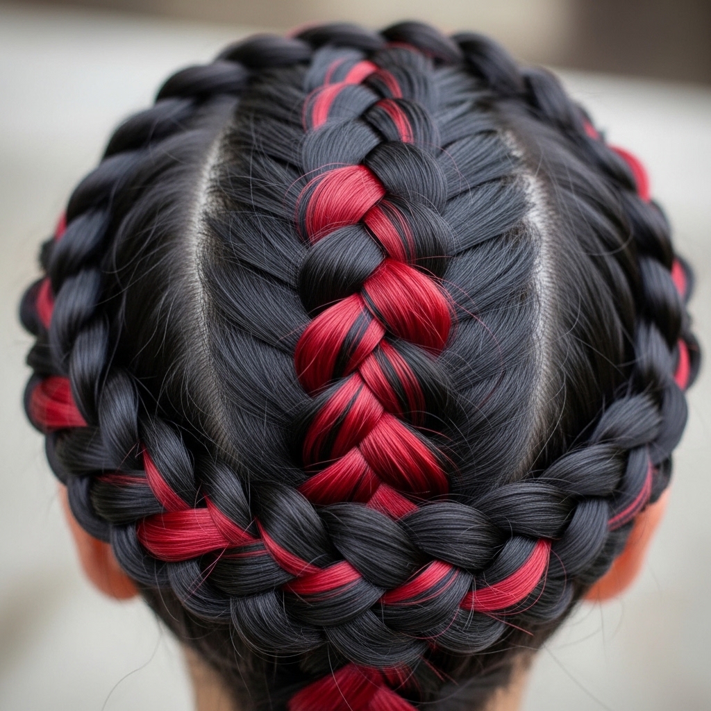 Divide your hair into two even sections. Before you start braiding, add a thin, red extension to each section. Then, simply do a standard three-strand braid, making sure the red strand is one of the three. The result is a beautiful, consistent stripe of color in each braid.