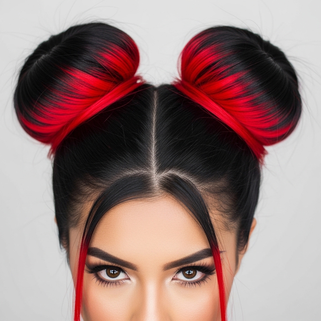 Playful goth? Absolutely. This style takes a fun, youthful updo and gives it a darkly romantic twist. The dipped ends add a pop of color and a touch of punk-rock flair that balances the cuteness of the buns.