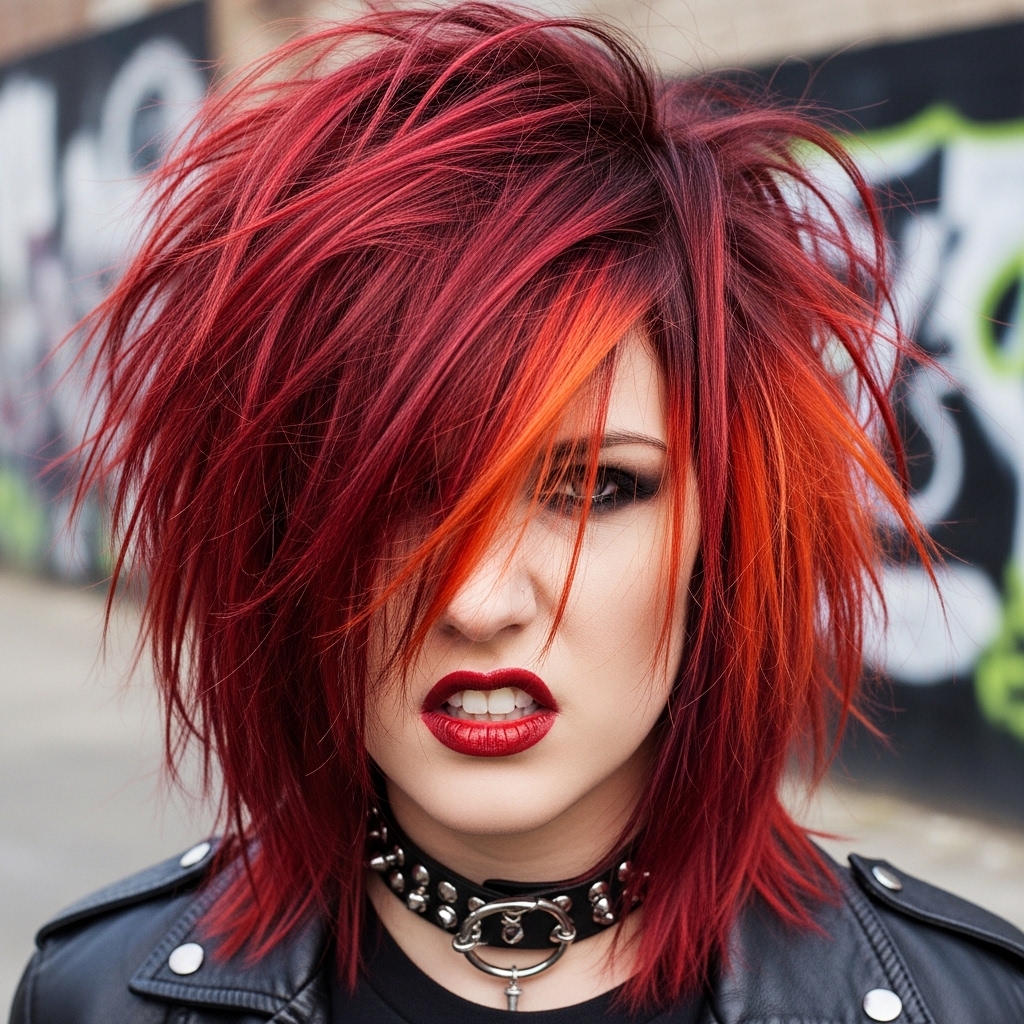 Channel serious 70s rockstar vibes with a shag cut that’s been kissed by gothic romance. This cut is all about movement, texture, and a carefree attitude. Adding red accents within the layers makes the whole style come alive.