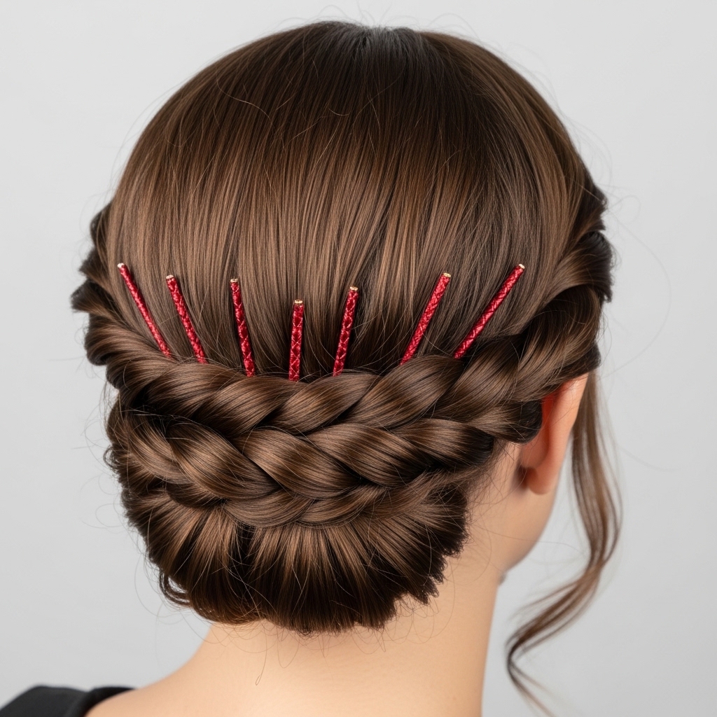 - Before securing, tuck in 2-3 thin red clip-in extensions near the base of the bun.