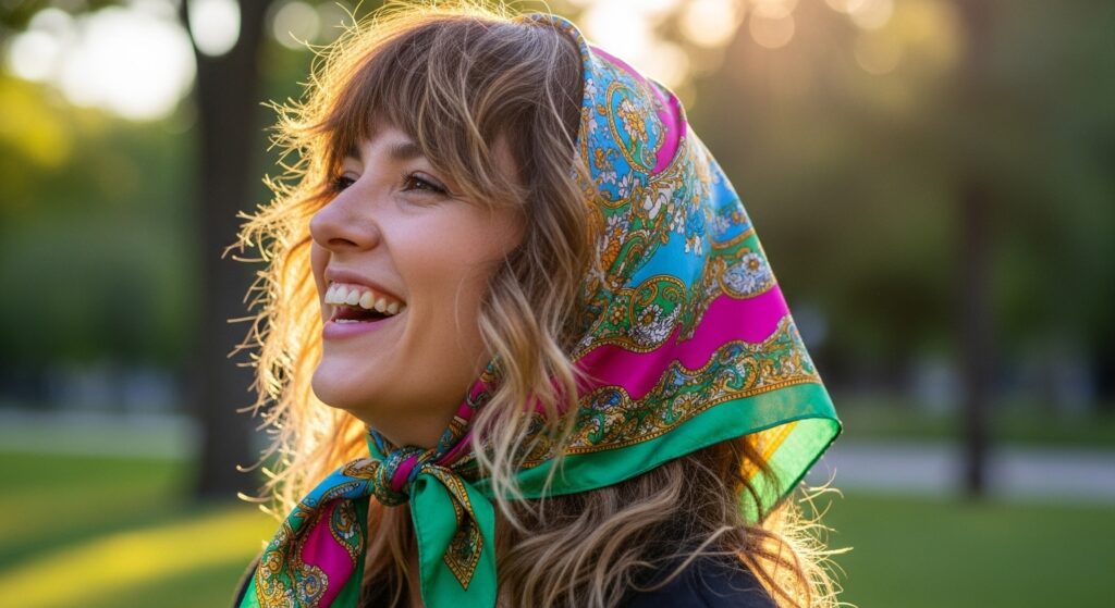 Alternatively, for a more boho feel, tie it over the top of your head, covering your crown, and tie it at the base of your neck. The shorter layers of your shag will peek out from the front and sides, creating an adorable, textured frame for your face. This look works beautifully on air-dried, wavy, or even slightly messy hair, making it the perfect zero-effort solution.