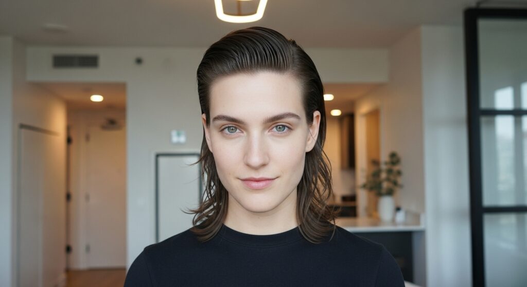 You can secure it in a low ponytail or let it hang loose. The crucial step is to break the cast. Once the gel is completely dry, take a drop of hair oil or serum on your fingertips and gently scrunch the lengths of your hair. This will soften the hard finish, leaving you with defined, slicked-back roots but soft, touchable ends. Your shag’s layers will create a beautiful, piecey texture in the back, preventing the look from feeling too severe.