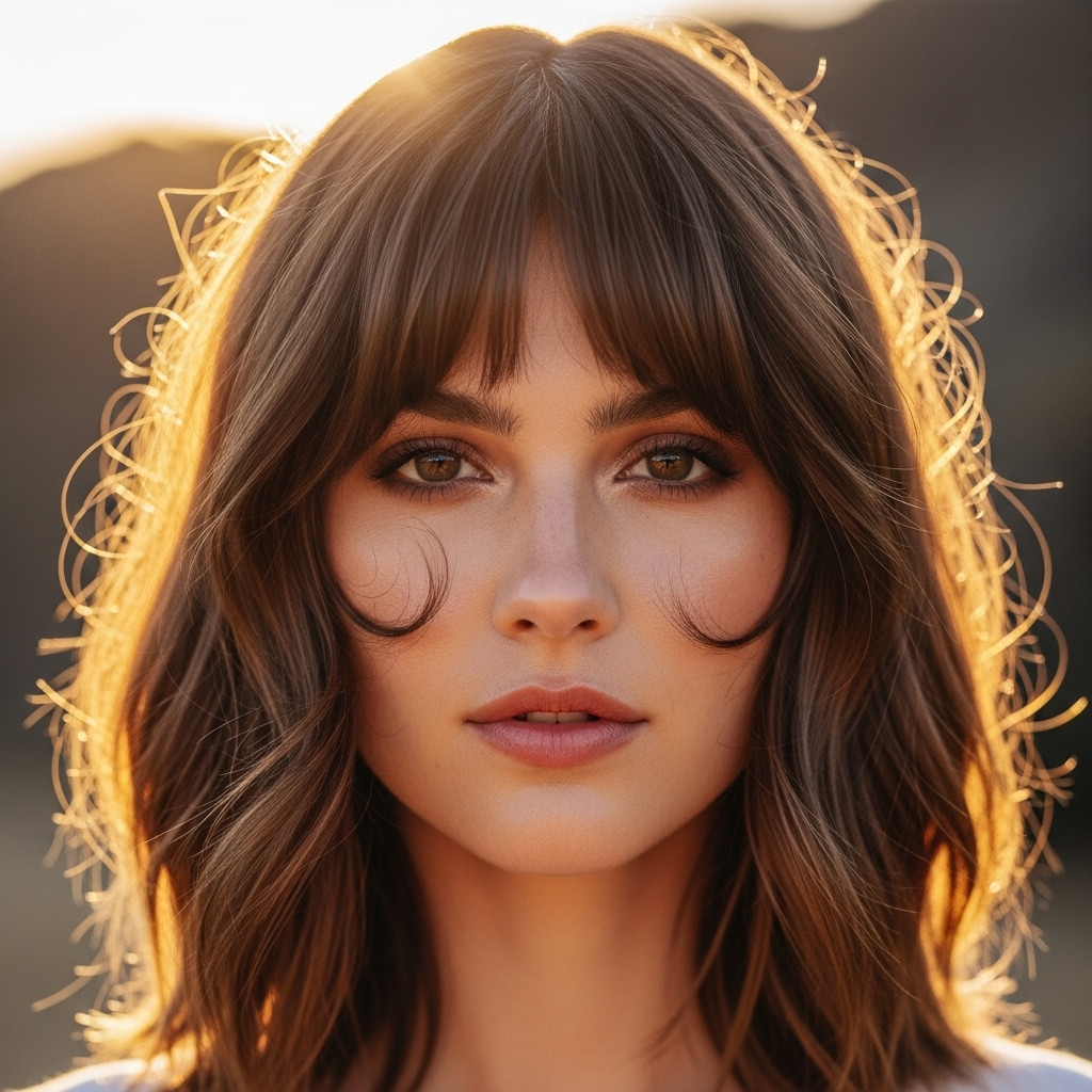 Curtain bangs have made a massive comeback, and your medium-length bangs are perfectly positioned to rock this retro-modern look. It’s a soft, face-framing style that complements nearly every face shape and adds a touch of effortless 70s-inspired glamour to any outfit.