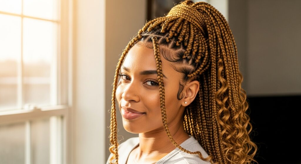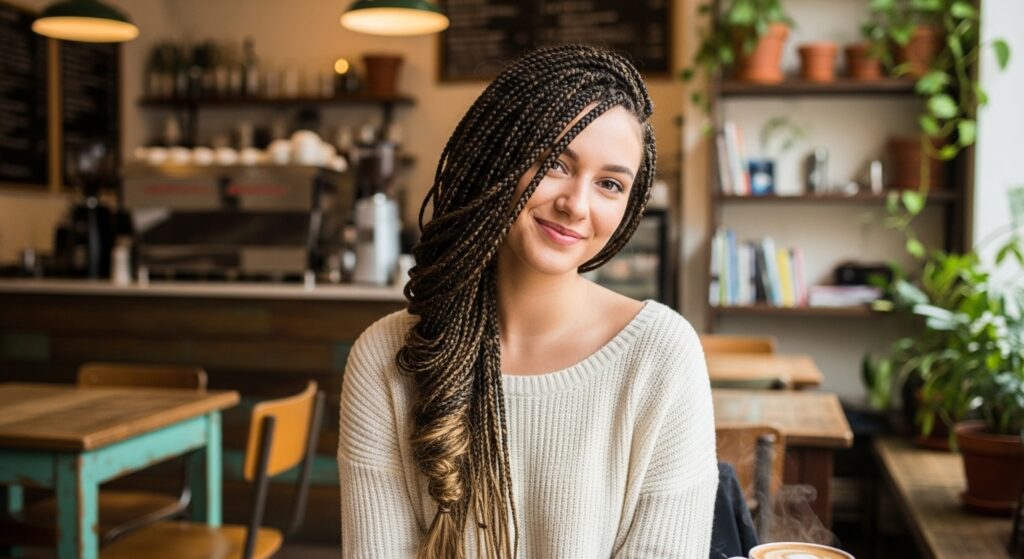 Embrace a bohemian vibe with a side-swept braid. This style works beautifully with medium to long braids and requires almost no skill. Simply gather all your braids to one side of your head. Then, loosely braid this large section all the way down. You don’t need it to be tight or perfect—the charm is in its relaxed, textured feel.