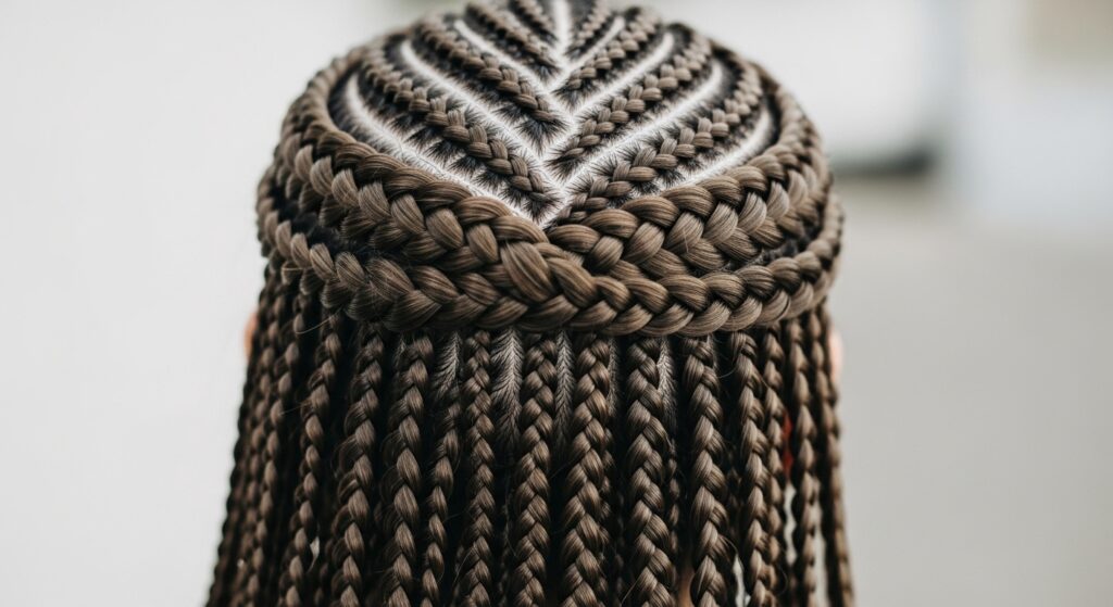 Gather these braids as if you’re making a half-up ponytail, but instead of securing it at the back, split the section into two parts. Twist or loosely braid each part and then cross them over the top of your head, pinning them securely at the back with bobby pins. This creates a beautiful crown effect that frames your face beautifully. It’s ideal for bad hair days when you still want to look polished.