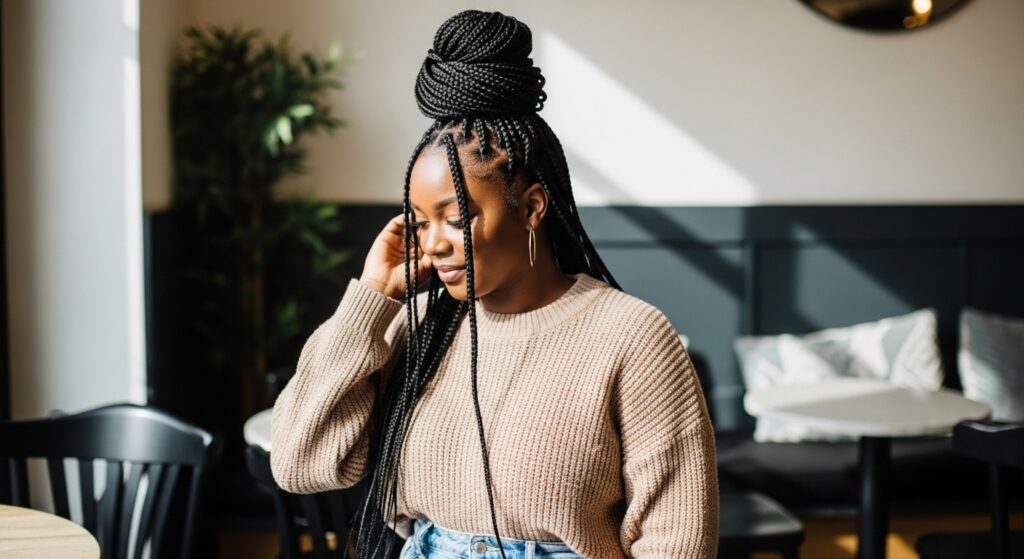 When you’re truly in a rush, the top knot is your best friend. This isn’t just any messy bun; it’s a statement. Gather your braids into a high ponytail, but instead of pulling them all the way through the hair tie on the last loop, leave the ends out to create a bun.