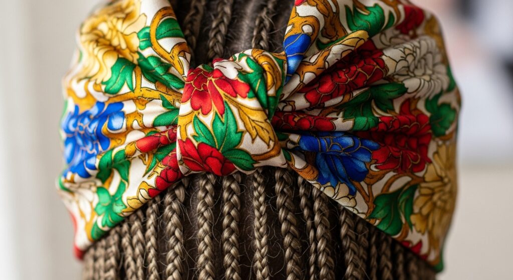 You can tuck all your braids into the wrap for a sleek, sophisticated look, or leave them flowing out the back for a more casual feel. This is not only a zero-effort style but also a powerful fashion statement. It’s the ultimate solution for a day when your braids feel a little frizzy or you just want to add a pop of color to your outfit.