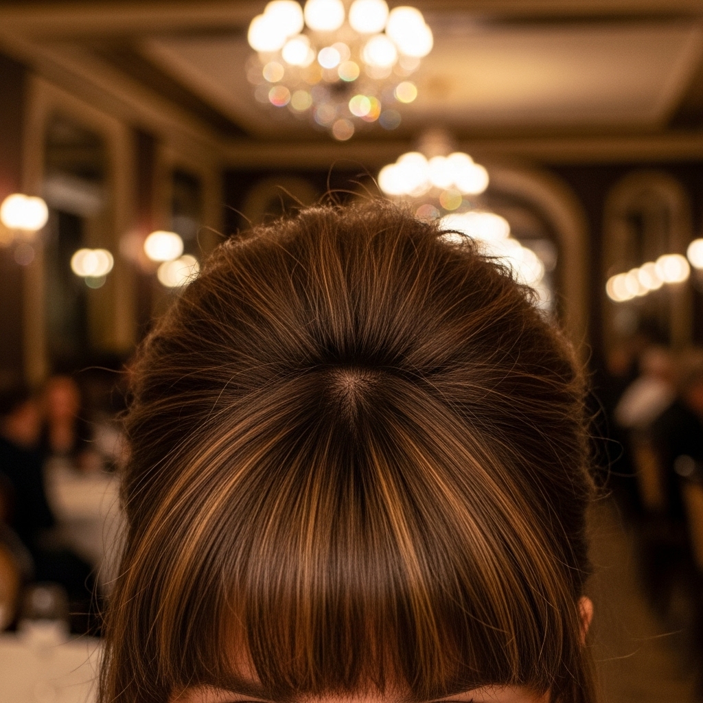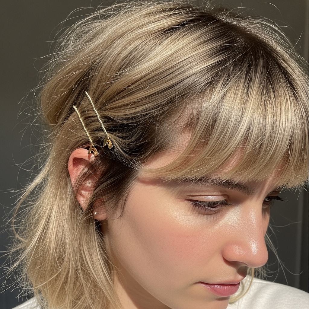 On days when you need your bangs completely out of your face but still want to look stylish, the textured pin-back is your savior. Instead of slicking them back, take two small, decorative pins or a simple bobby pin. Gently pull the front sections of your bangs back, criss-cross the pins to secure them, and allow some pieces to fall loosely around your face.
