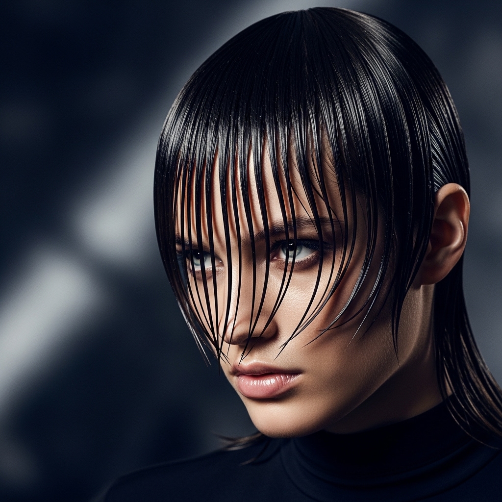 Embrace the high-fashion slicked-down wet look. Apply a strong-hold gel or a sleek styling cream to your damp or dry bangs and comb them flat against your forehead. The beauty of textured bangs in this style is that the ends may still want to kick up or separate slightly, adding a deconstructed, artistic touch to the otherwise severe look.