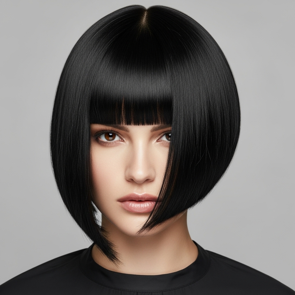 Ask for an extreme angle—chin-length on the short side, shoulder-length on the other. Pair it with curtain bangs or a deep side part. Keep the color dark and the finish sleek for that modern vampiric allure.