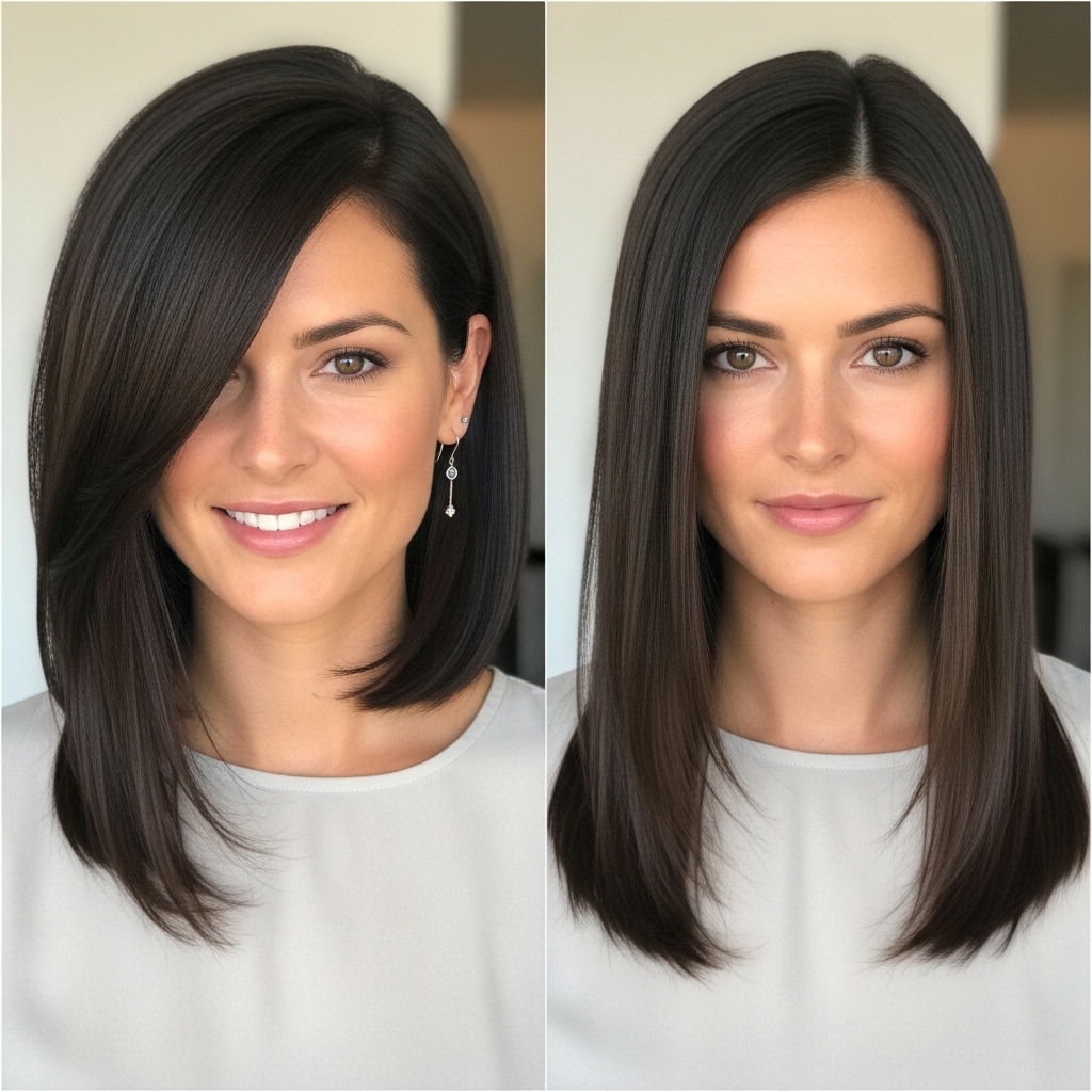 For oval faces, both work beautifully! Experiment. Try a deep part for a night out and a center part for day. It’s the easiest way to get two different looks from one haircut.