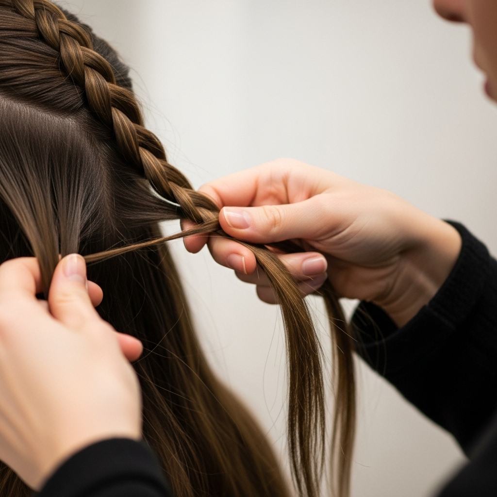 3. Continue this pattern, always dropping the bottom strand and replacing it with fresh hair, creating a “waterfall” effect.