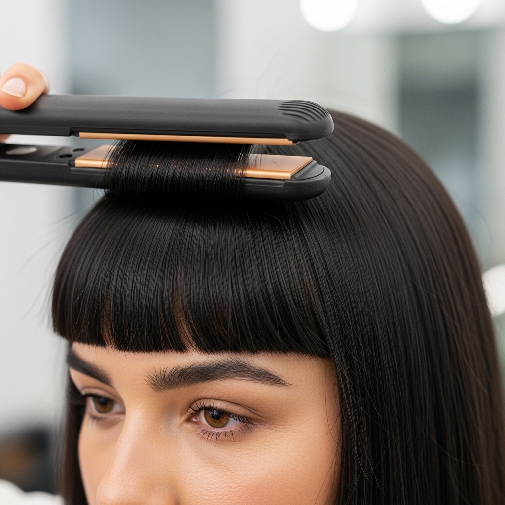 Style them straight with a flat iron or leave them natural. The key is that blunt, across-the-forehead line that defines the cut.