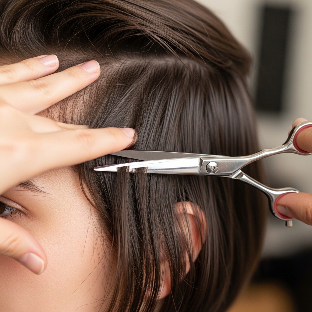 Take one of the cheek sections. Pull it straight down and trim it to your desired length—anywhere from chin to jaw-length is perfect. Use your jawbone as a guide. Repeat on the other side.