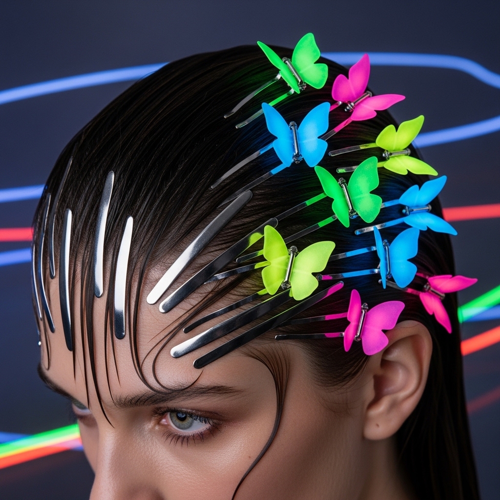 For a true glitchy glam hair moment, go bold with your clips. Use neon colors, mix different sizes wildly, and place them in unexpected spots—like clipping a few into your bangs or down the length of your hair.