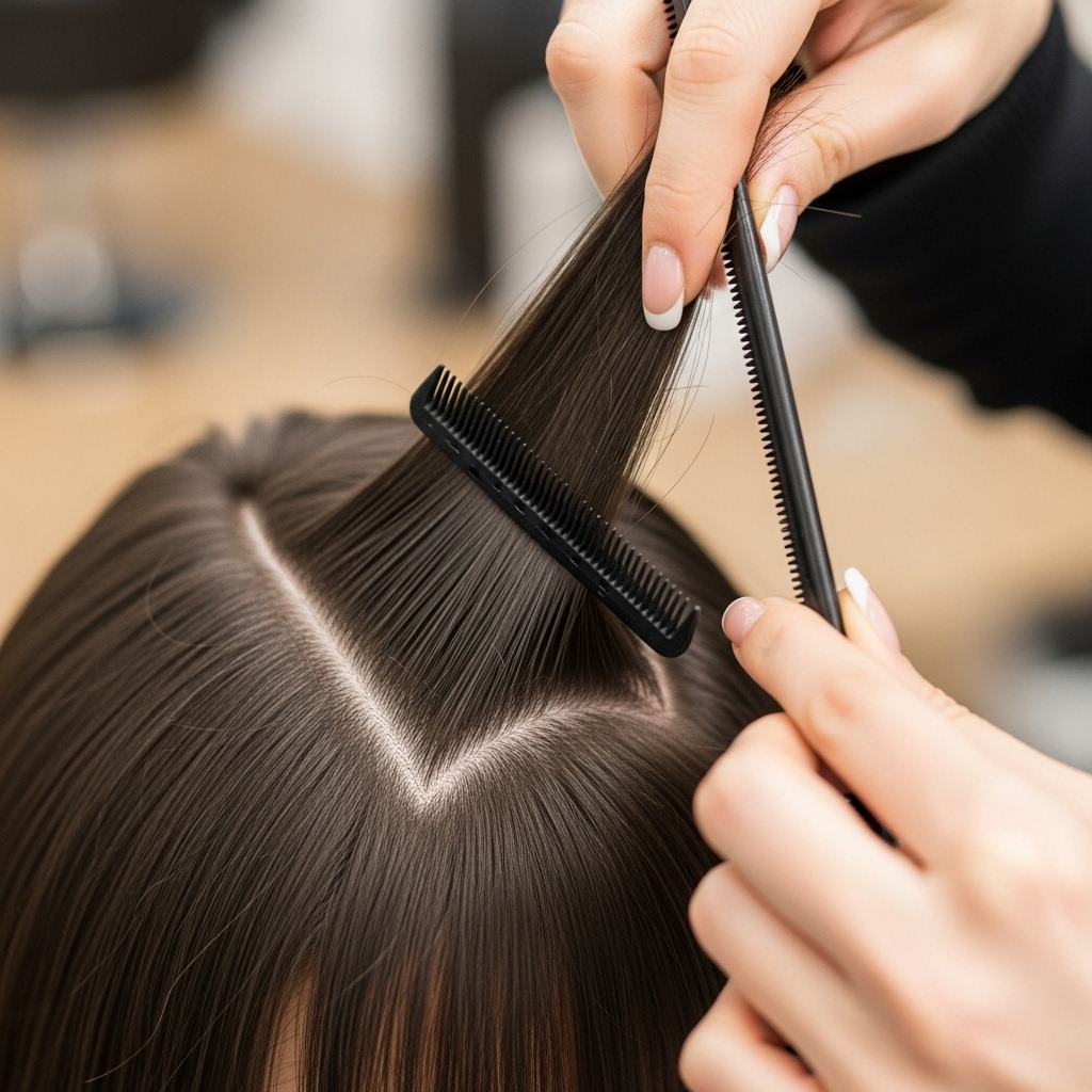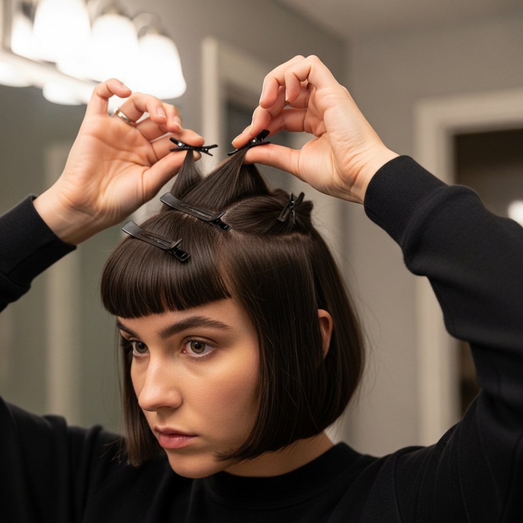 Start with dry, styled hair. Use your comb to create a triangular bang section. Start from the crown of your head down to your temples. This section should be wider than you think—it needs to cover from temple to temple.