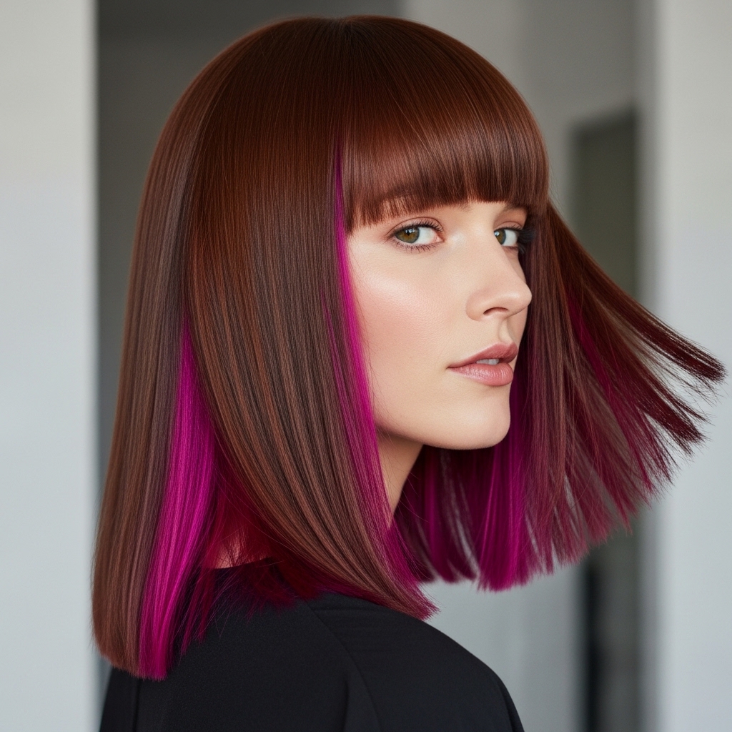 This is one of my favorite tricks. From the top, your hair looks like a simple, healthy blunt cut in a natural color—like a chestnut brown.