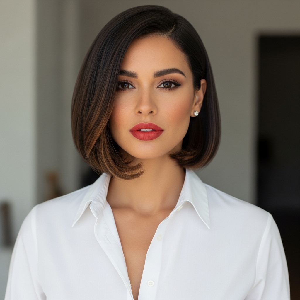 The Quiet Luxury Bob with a “Burnt Coral” Lip