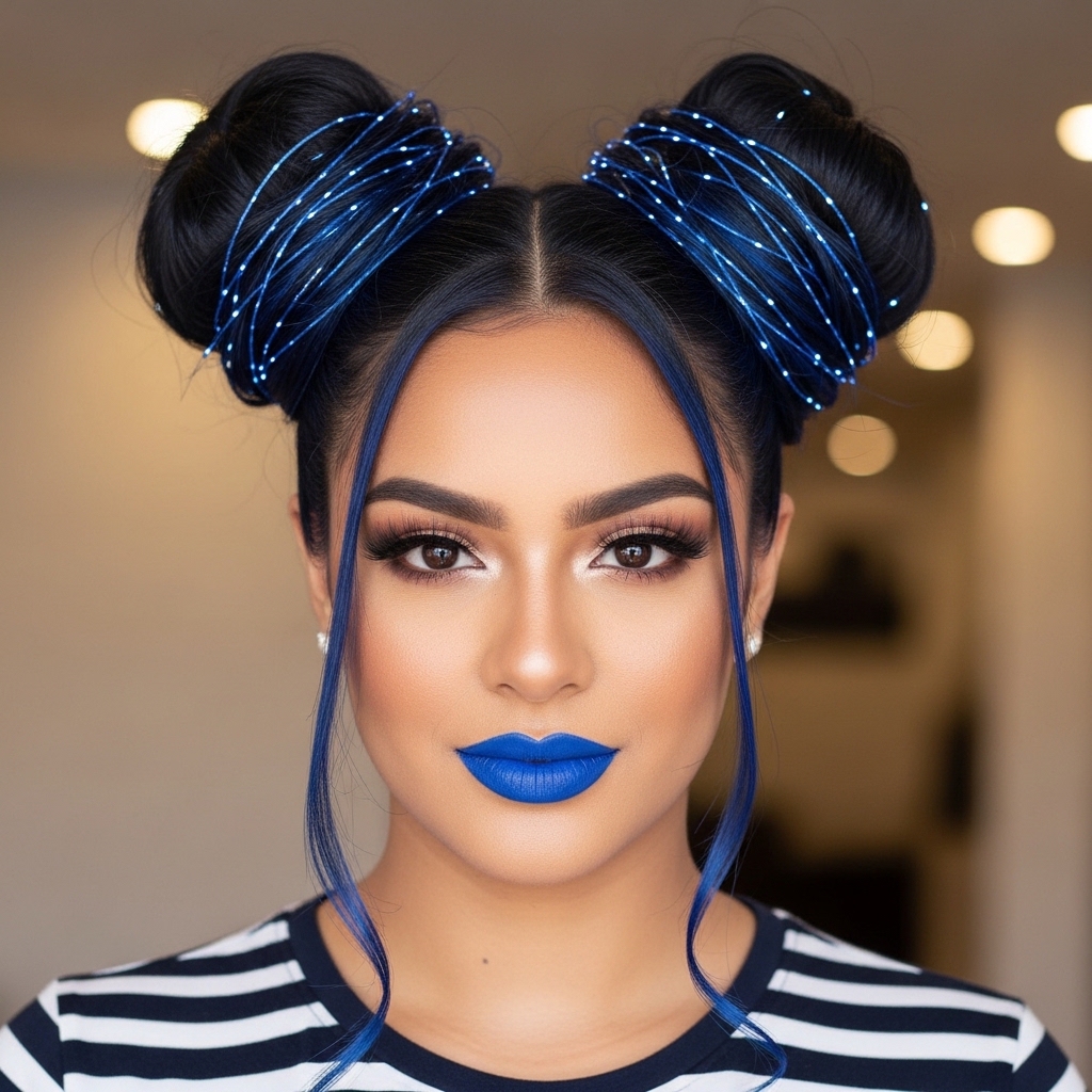 Before twisting each section into a bun, take a small, front strand from each side and dye it with a temporary color spray or gel—think electric blue, neon green, or hot pink.
