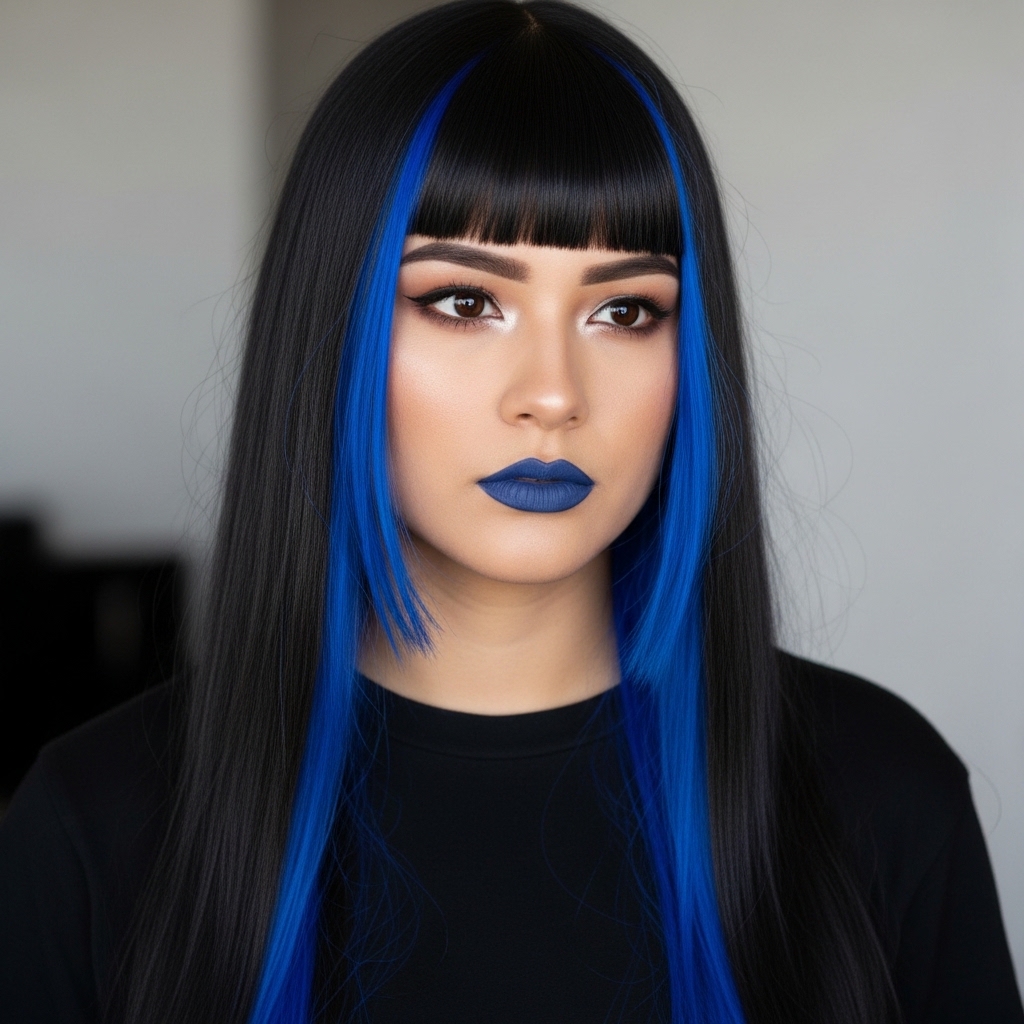 For a true glitchy glam moment, keep the main body of your hair a solid, inky black. Then, take the long, front sidelocks and dye them a shocking electric blue. When your hair moves, it’s like a digital flash.
