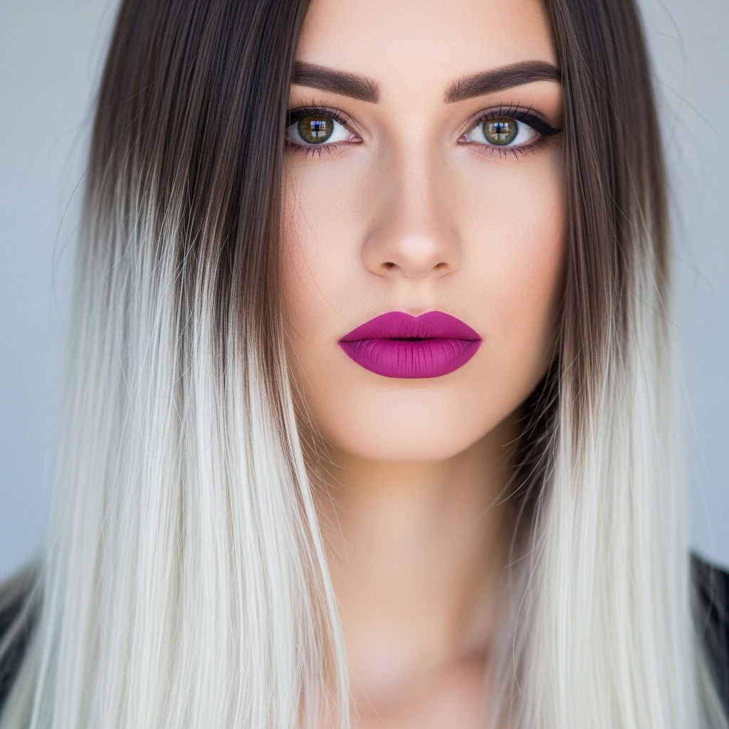 And the best part? You can match your hair to your makeup for a full, head-to-lip moment. It sounds daring, but I promise it’s easier to pull off than you think. Let’s dive into some of my favorite glitchy glam two-toned hair and lip combos that are totally wearable.