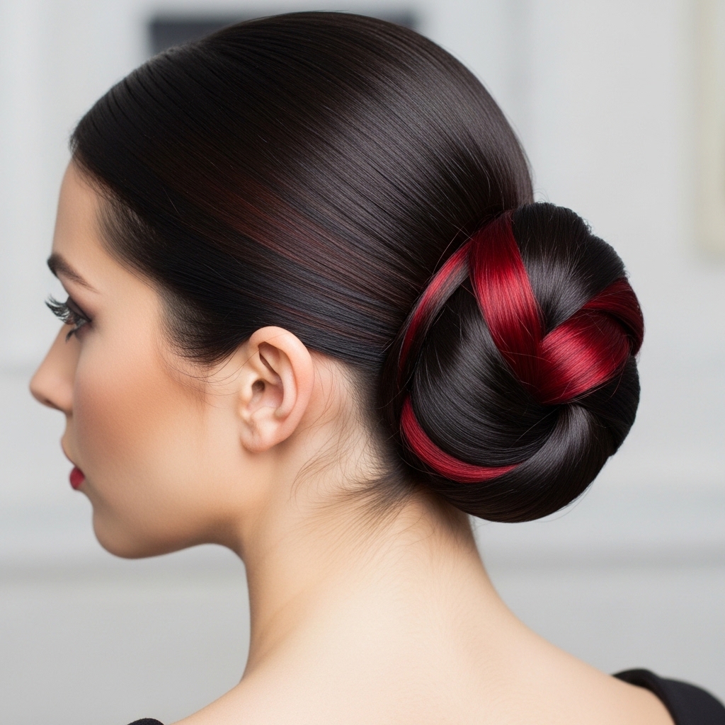 When your hair is down, it’s a sophisticated solid color. When you put it up in that perfect bun, you get a flash of personality. Keep your lip a timeless, creamy red to match the hidden pop. It’s secret glamour.