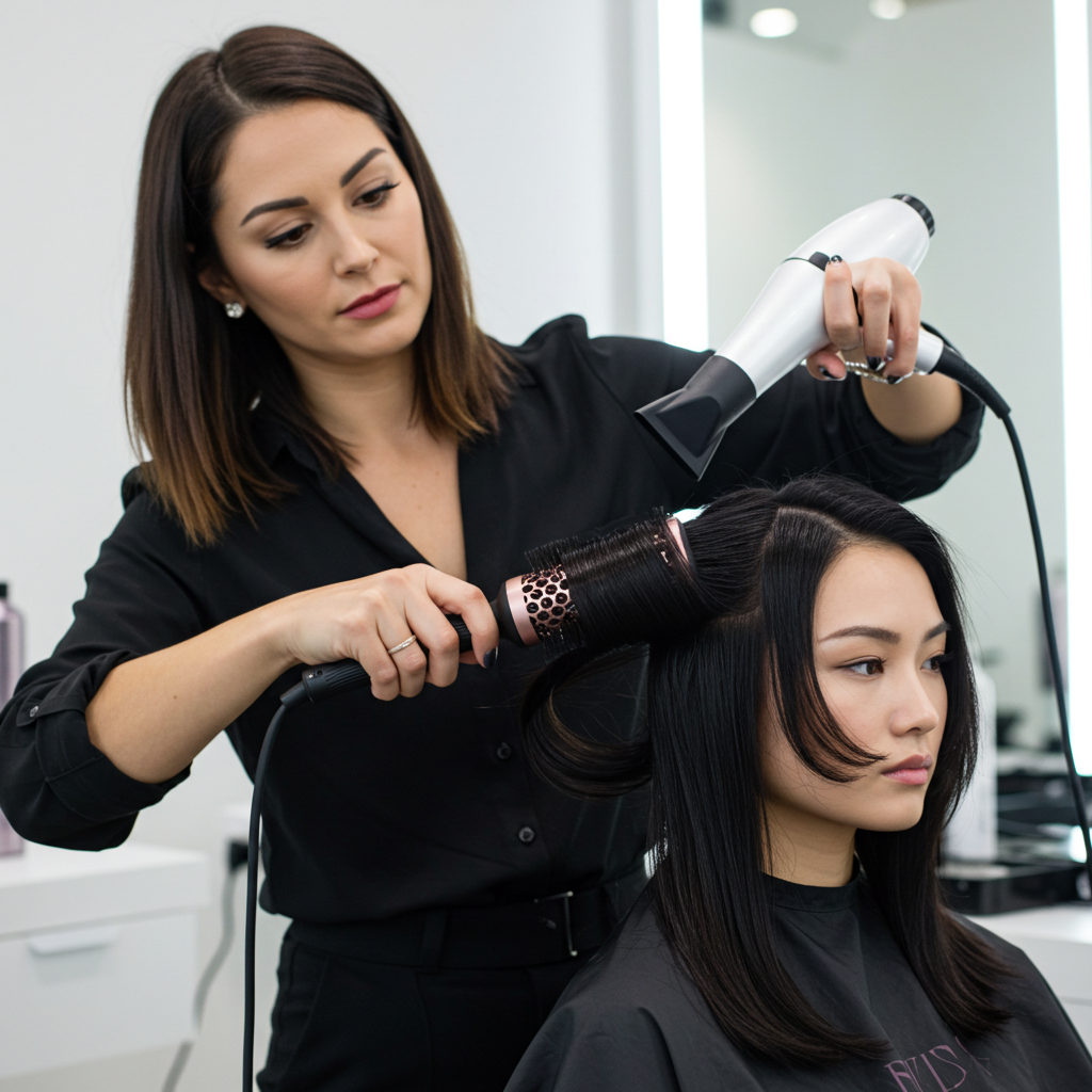 Most people blast their hair with high heat and hope for the best, but stylists use a more strategic approach. They start by rough-drying hair at medium heat until it’s about 80% dry, then switch to a lower setting for the final polish. Always point the nozzle downward to smooth the cuticle and reduce frizz. Bonus tip: A round brush helps add volume and bounce!