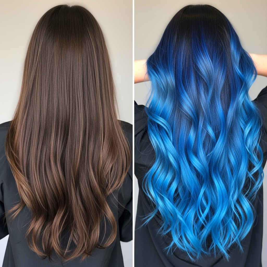 The final look features deep navy roots melting into bright cerulean ends, creating a stunning dimensional effect that turns heads everywhere.