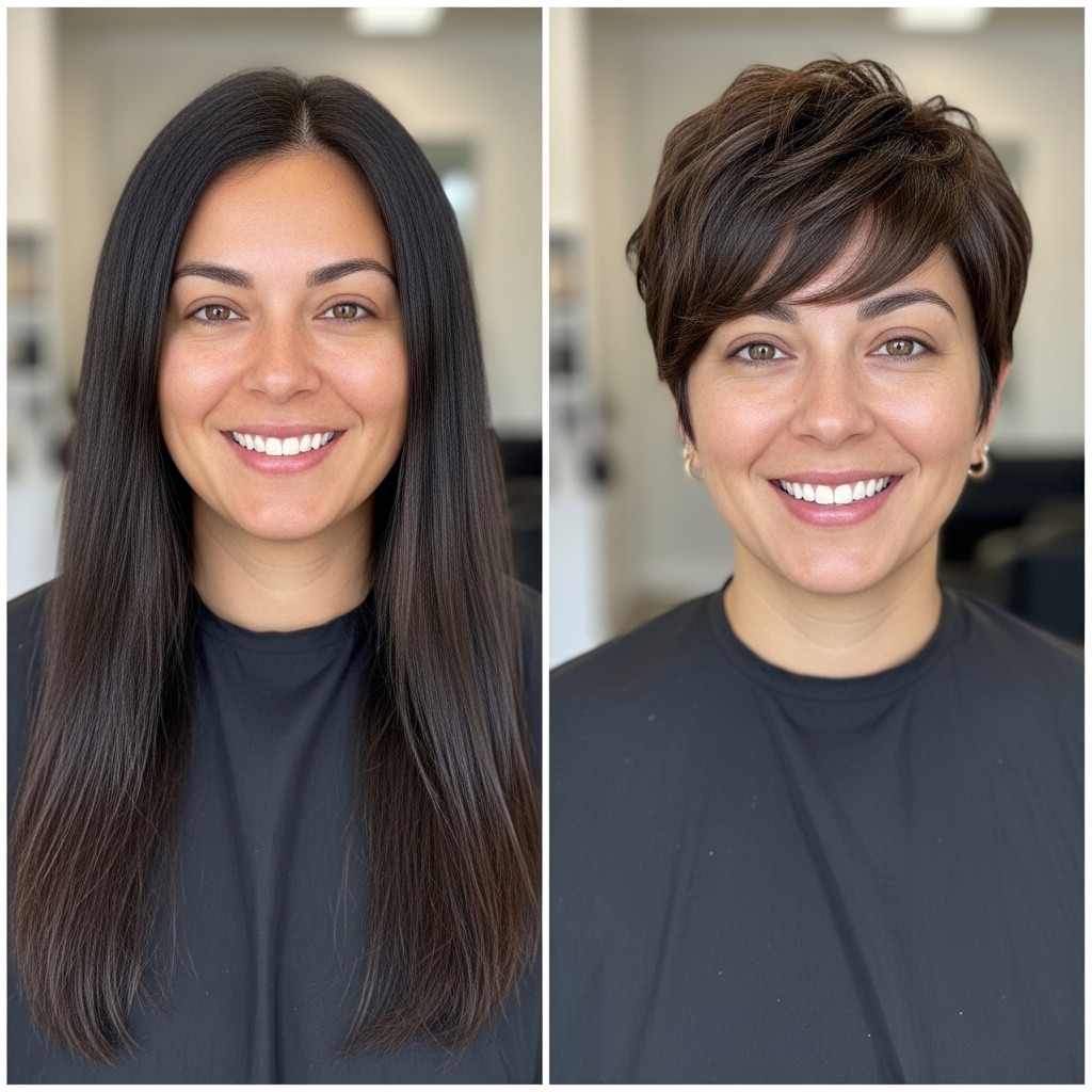 Our final transformation features the most dramatic length change – Alex went from waist-length hair to a bold, textured pixie. This makeover wasn’t just about style – it represented a major life change and new confidence.