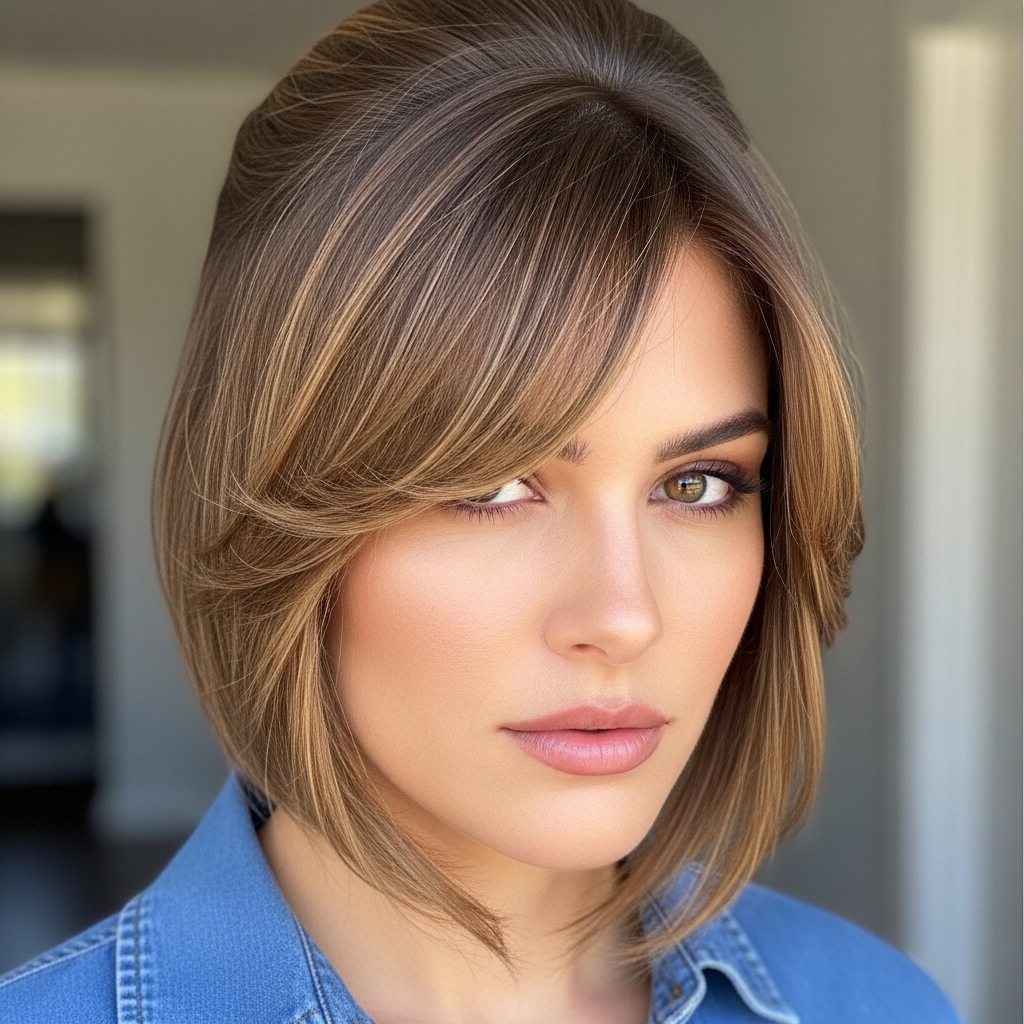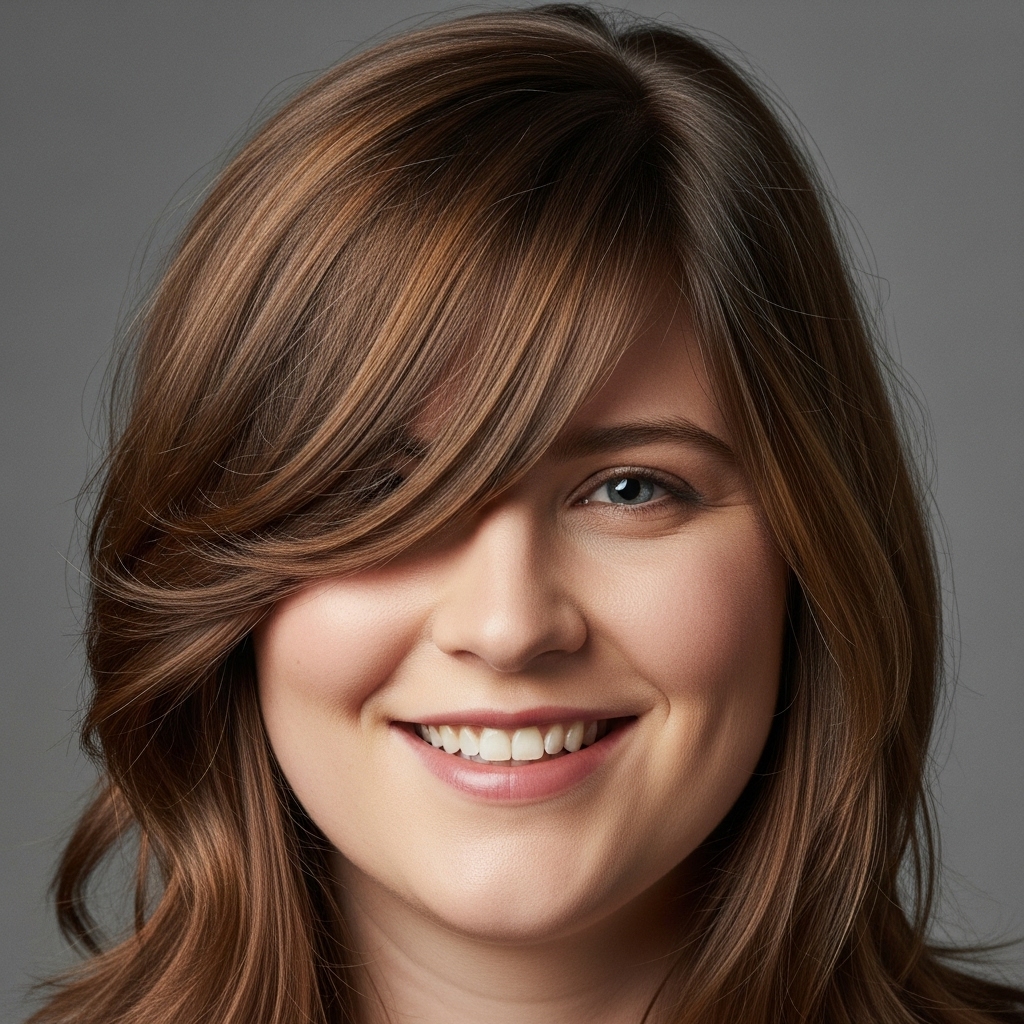 Wispy, Side-Swept Bangs: This is the gold standard for round faces. The diagonal line created by side-swept bangs breaks up the circular shape of the face and adds much-needed angles. Keep them long and feathered, grazing your eyebrows or even your cheekbones, to draw the eye across and down, elongating your face.