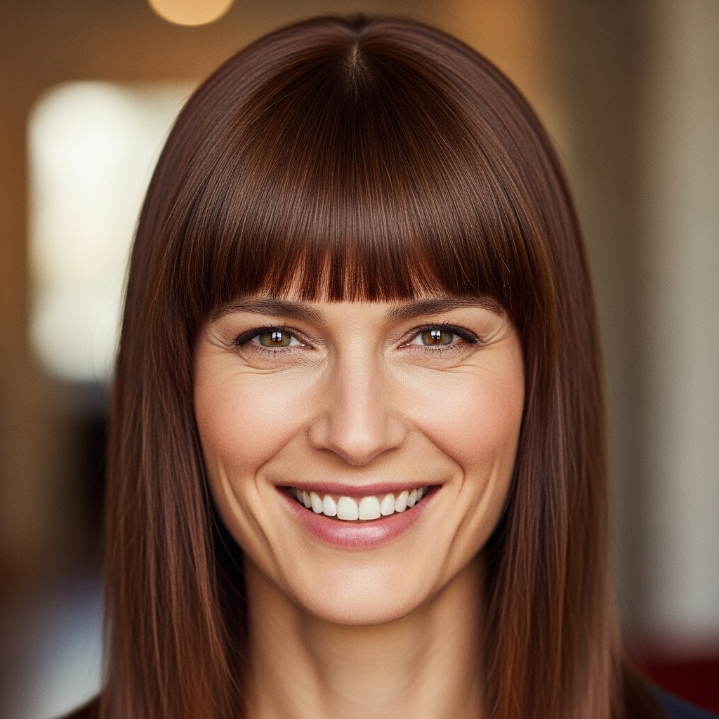 Blunt Bangs: You have the symmetry to carry off a strong, statement-making blunt fringe. This bold look draws attention directly to your eyes and can give a modern, chic edge to your style.