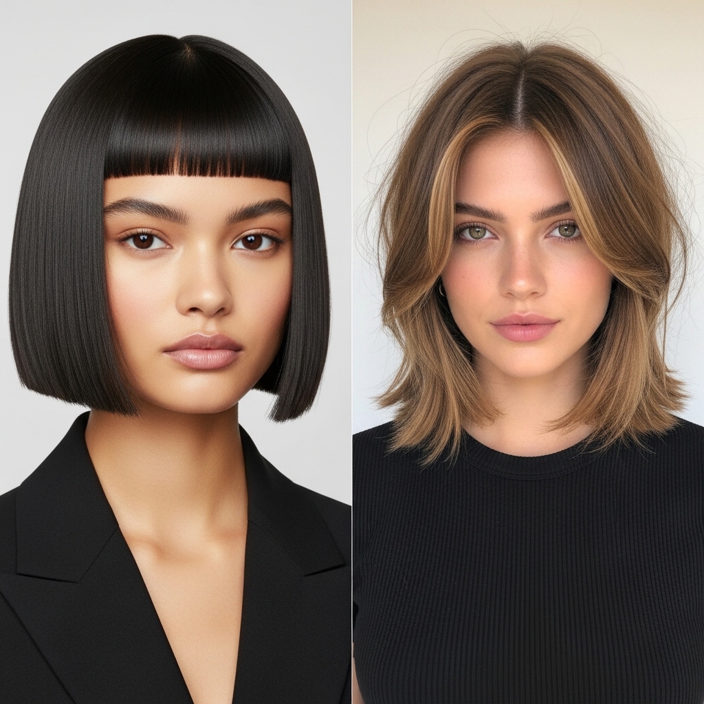 While both are stunning, they create a very different look. The hime cut is bold and graphic. The lob is fluid and relaxed.